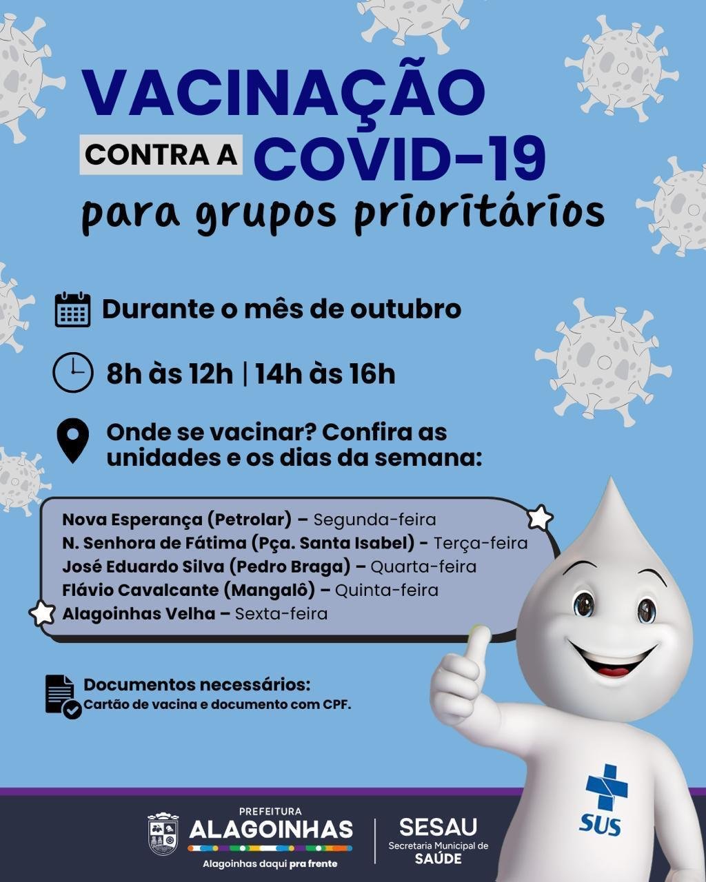 A Secretaria Municipal da Saúde (Sesau) de Alagoinhas inicia, durante o mês de outubro, a vacinação contra a Covid-19 direcionada exclusivamente aos grupos prioritários, conforme as orientações do Ministério da Saúde. O objetivo é garantir a proteção da população mais vulnerável.