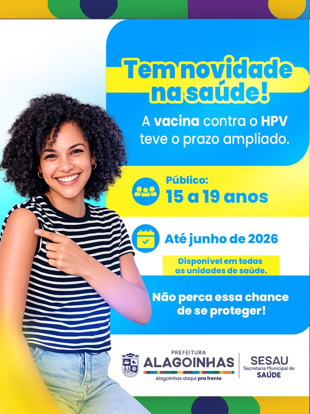 A Secretaria Municipal de Saúde de Alagoinhas prorrogou campanha de vacinação contra o Papilomavírus Humano (HPV) até junho de 2026. A medida busca ampliar a cobertura vacinal de adolescentes na faixa etária de 15 a 19 anos que não receberam o imunizante na idade preconizada pelo Ministério da Saúde.
