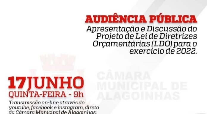 A Câmara Municipal de Alagoinhas irá transmitir amanhã, quinta-feira(17), a partir das 9 horas da manhã, a audiência pública que discutirá o projeto da Lei de Diretrizes Orçamentárias(LDO) para o exercício financeiro de 2022. A audiência contará com a...