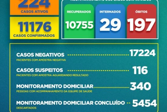 Com a atualização, o município contabiliza 224 casos ativos, 116 moradores que aguardam resultados do Laboratório Central de Saúde Pública (LACEN), 29 pessoas hospitalizadas e 197 óbitos, após investigação e qualificação entre estado e município.