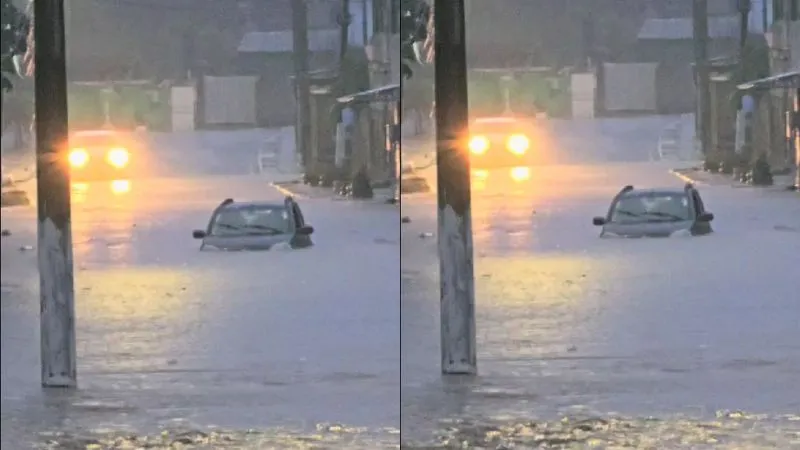 Em Dias D’Ávila um morador mostrou um carro completamente submerso em meio à enorme quantidade de chuva em uma das ruas da cidade.