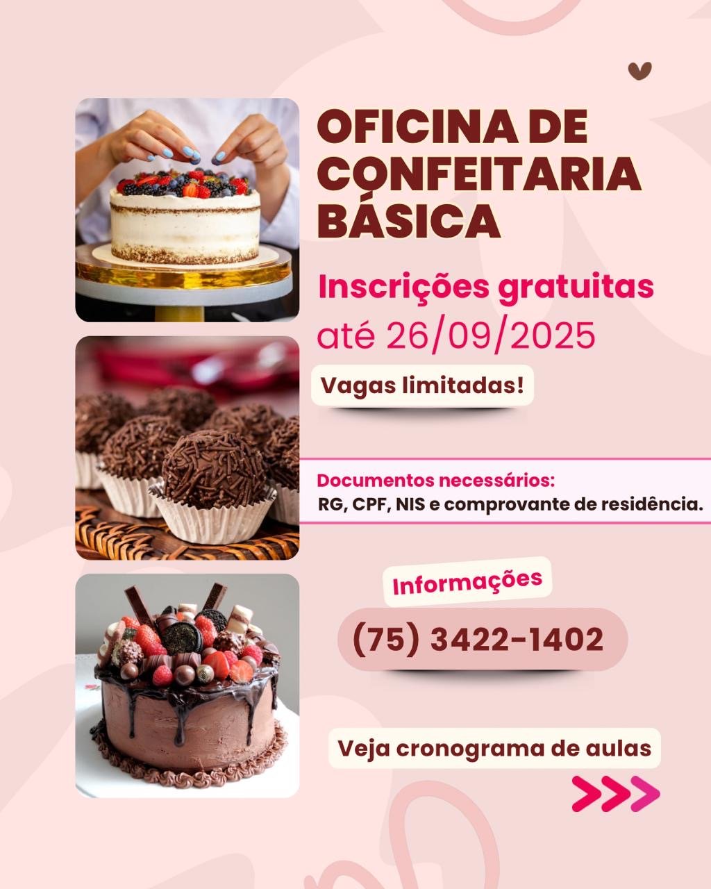 A Prefeitura de Alagoinhas está com inscrições abertas para a Oficina de Confeitaria Básica, uma oportunidade para quem deseja aprender técnicas essenciais e ampliar as chances de geração de renda. A ação é uma iniciativa da Secretaria de Desenvolvimento Social (Sedes).