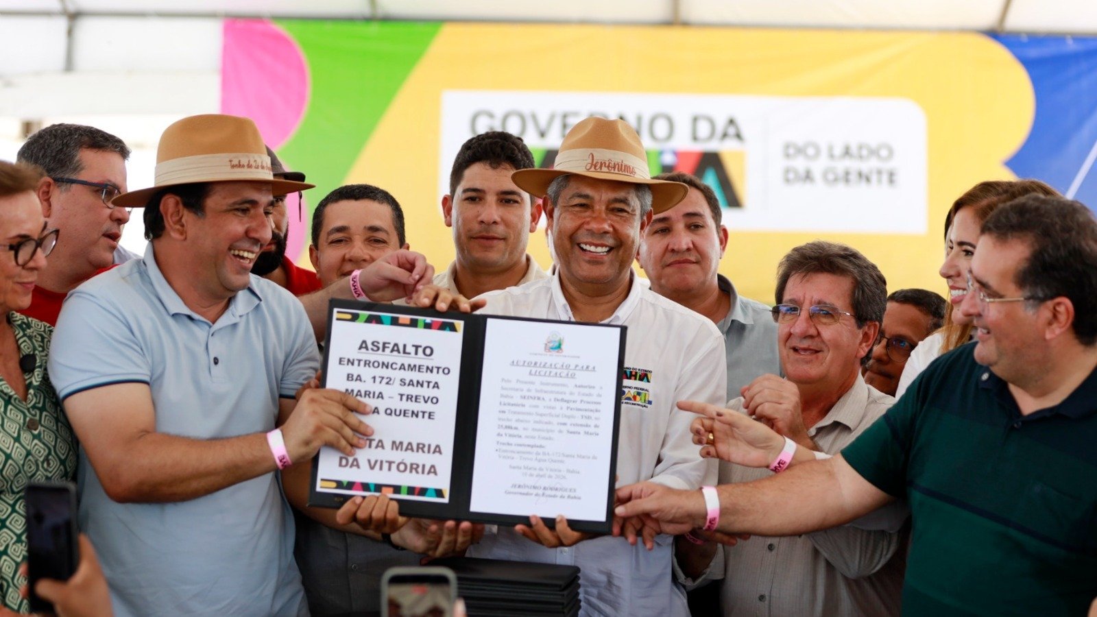 Foram autorizadas as licitações para: pavimentação no bairro Sambaíba, drenagem e asfalto no Parque de Exposições, construção de ciclovia na BA-172, no trecho entre Santa Maria da Vitória ao Cuscuzeiro; pavimentação em TSD no acesso a Montevidinha e no entroncamento da BA-172, entre Santa Maria da Vitória e o Trevo Água Quente. Jerônimo também autorizou a construção de praça no bairro Malvão.
