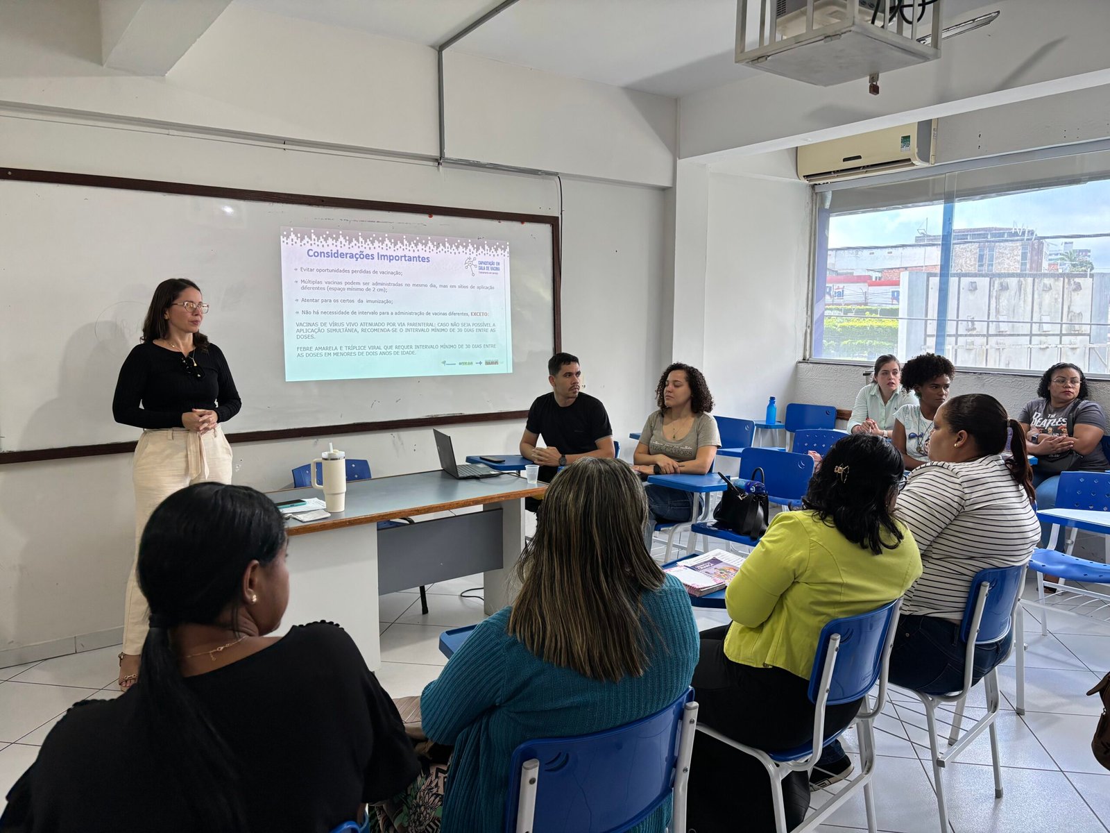 A capacitação engloba vacinação infantil, do adolescente, do adulto e do idoso; aborda todas as vacinas que são contempladas nos calendários, vacinação da COVID, da Influenza, vacinação antirrábica humana; rotina e organização do serviço; e atendimento ao usuário.