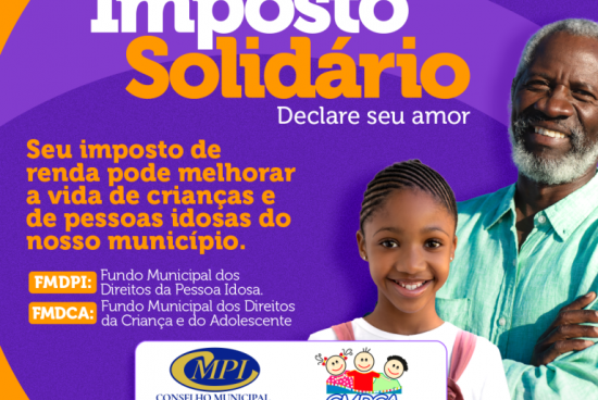 A campanha “Imposto Solidário, Declare seu Amor” segue até o dia o dia 31 de maio, prazo para a entrega da Declaração do Imposto de Renda das Pessoas Físicas (IRPF). Esta é uma iniciativa do Conselho Municipal do Idoso e do Conselho Municipal dos Direitos da Criança e do Adolescente (CMDCA), em parceria com a Secretaria Municipal de Assistência Social (SEMAS).