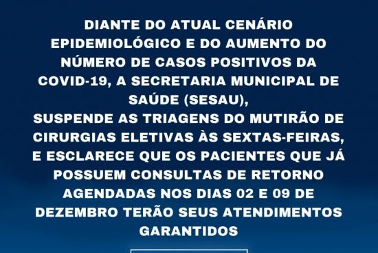 Diante do atual cenário epidemiológico e do aumento do número de casos positivos da COVID-19, a Prefeitura de Alagoinhas, por meio da Secretaria Municipal de Saúde (SESAU), informa que as triagens do mutirão de cirurgias eletivas será suspenso.